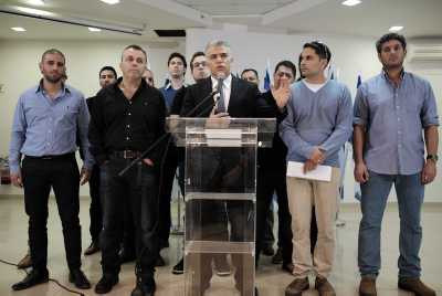 Entouré d’officiers de réserve et muni d’une pétition signée par 600 anciens soldats, M. Lapid a affirmé venir « défendre les valeurs de Tsahal ».