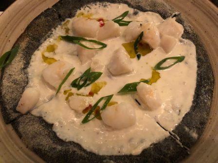 On y ajoute la juteuse poitrine de canard, fort bien cuite, avec ses tortellini à l’ail noir – un peu sucrés – il faut dire qu’outre une crème de chou fleur, des asperges et brocolis, le tout est renforcé d’un jus de volaille au Pedro Ximenez. Bref, c’est joli et bon, même si cela part en tout peu sens, avec ces plats qu’on propose crus, rôtis, mijotés, vapeur ou au four et qui mélangent volontiers – et toujours richement – huile d’olive et crème.