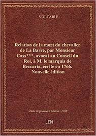 Dans la Relation de la mort du chevalier de La Barre à Monsieur le marquis de Beccaria, récit d’une vingtaine de pages écrit sous pseudonyme, Voltaire démontrera la disproportion existante entre la nature du délit – une provocation de jeunes gens – et la sentence indigne. Le philosophe consacrera encore l’article Torture de l’édition de 1769 du Dictionnaire philosophique au martyre du chevalier de La Barre, jeune homme de beaucoup d’esprit et d’une grande espérance, convaincu d’avoir chanté des chansons impies, et même d’avoir passé devant une procession de capucins sans avoir ôté son chapeau, auquel les juges d’Abbeville, gens comparables aux sénateurs romains, ordonnèrent, non seulement qu’on lui arrachât la langue, qu’on lui coupât la main, et qu’on brûlât son corps à petit feu.