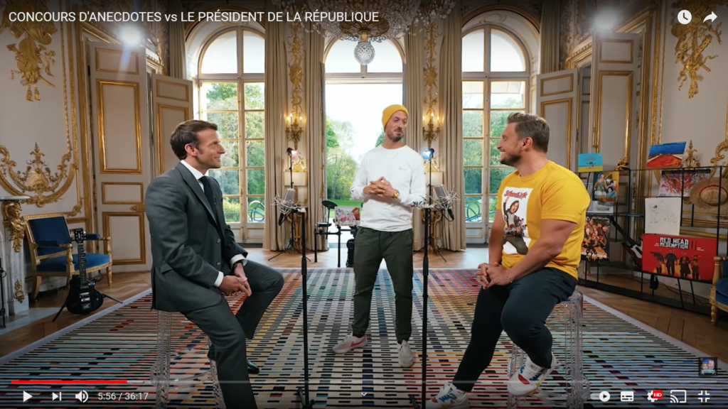 Non, Messieurs, contrairement au match nul affiché, le concours d’anecdotes s’est soldé par la victoire des jeunes McFly et Carlito contre Macron ! Ces deux youtubeurs (vidéastes humoristes) à succès sont adorés des jeunes. Dimanche 23 mai, Emmanuel Macron les a invités à l’Élysée après qu’ils ont dépassé les 10 millions de vues dans une vidéo appelant au respect des gestes barrière. Le chef de l’Etat s’est livré avec ses invités à quelques devinettes ras des pâquerettes avec un peu de « J’me la pète », notamment en appelant Kylian M’bappé (du 100 % improvisé, bien entendu !). Au passage, de la nonchalance sur l’usage de drogues par les uns et les autres… Gerald Darmanin a dû se dire : « C’est de la merde ! » (la drogue ou la légèreté de leurs propos cannabissaux). Et pour finir, quoi de mieux qu’un petit concert de métal dans les jardins de l’Élysée dont le genre musical vient de gagner l’Eurovision. Résultat : plus de 10 millions de vues sur Youtube, dans les vingt-quatre heures suivant le show.