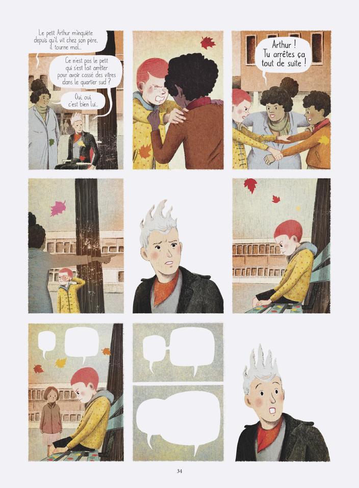 Le caractère un peu fantomatique de la deuxième case, encore plus flagrant en version papier, sied particulièrement à la séquence, même s’il n’est pas totalement volontaire. «Le papier, en absorbant l’encre, a créé ce voile un peu brumeux, un peu laiteux… Je trouve ça très chouette !», confie la dessinatrice, qui travaille à la tablette numérique. «J’ai créé mes petits pinceaux, mes trames et j’ai beaucoup travaillé par gommage et avec des filtres, en superposition, qui changent les couleurs… En essayant toujours de rejoindre le traditionnel», souligne celle qui a fait une formation aux beaux-arts et réalise des peintures en parallèle de la bande dessinée.