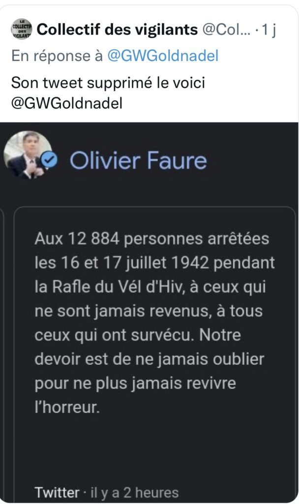 In fine, alors que se succèdent de toutes parts les témoignages et hommages, qu’ils semblent dérisoires, les propos d’un Eric Zemmour selon lequel le maréchal Pétain aurait sauvé des juifs français durant la Seconde Guerre mondiale, lorsqu’on est comme giflés par la lâcheté d’un Olivier Faure, qui a dû travailler long temps pour évoquer les victimes de la Rafle… sans prononcer le mot JUIF.