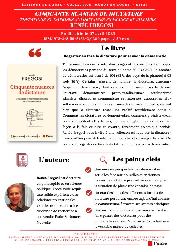 Tentations et menaces autoritaires agitent nos sociétés, tandis que les démocraties perdent du terrain?: entre 2015 et 2021, le nombre de démocraties est passé de 104 (63?% des pays de la planète) à 98 (soit 56?%). Certains refusent de nommer la dictature, d’aucuns l’appellent démocratie, d’autres encore ne savent pas la définir. Pourtant, démocratures, protototalitarismes, totalitarisme islamiste, dinosaures communistes remastérisés, autocraties néo-sultaniques ou juntes militaires – sous des formes multiples, on voit bien que la dictature reste une réalité terriblement actuelle. Comment les dictatures adviennent-elles, comment y résiste-t-on, comment cèdent-elles le pas, comment juger leurs crimes?? De façon à la fois érudite et vivante, forcément polémique parfois, Renée Fregosi nous invite à une réflexion critique sur la dictature d’aujourd’hui pour défendre la démocratie et envisager l’avenir. Ou comment regarder en face la dictature… pour sauver la démocratie.