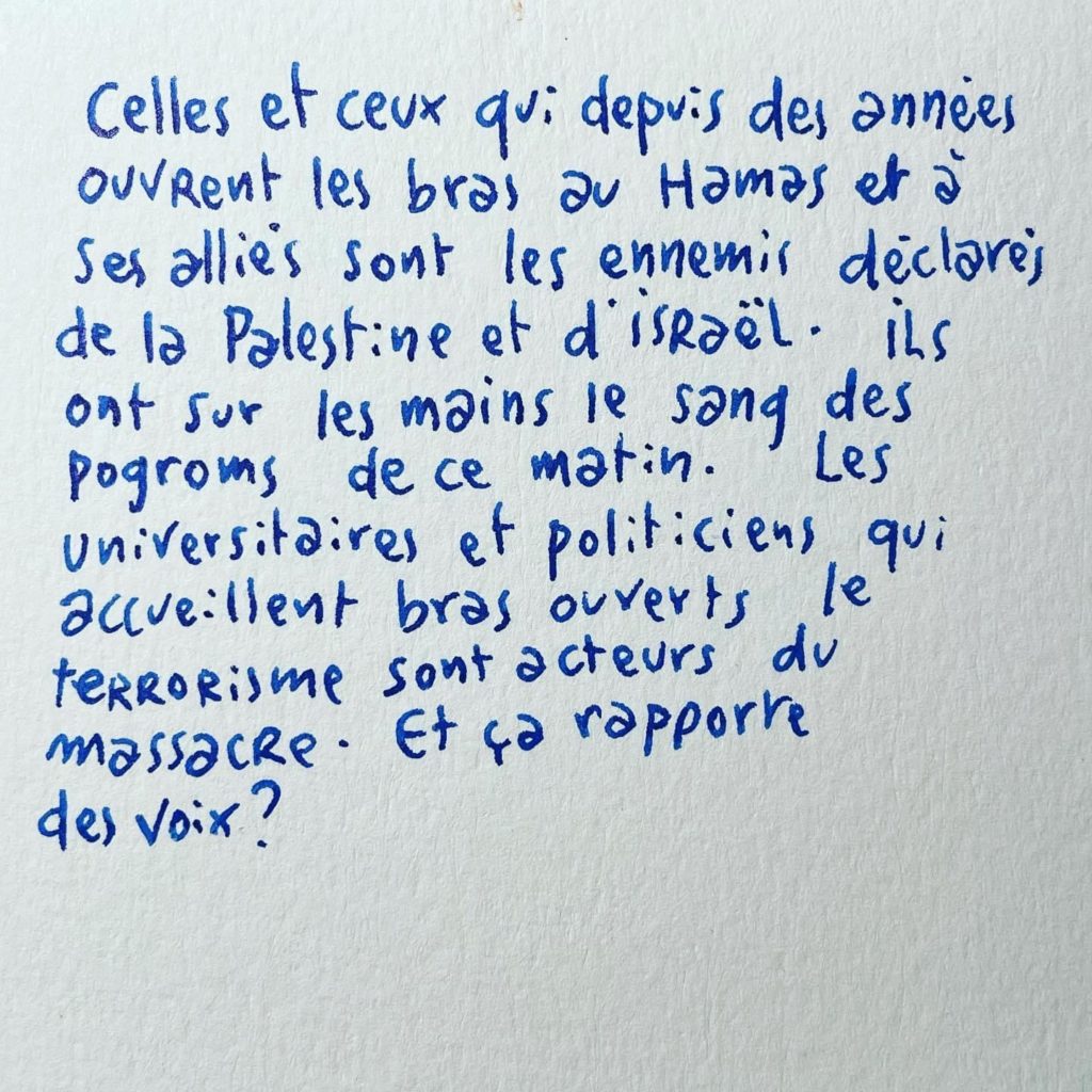 Il faut être d’une absolue mauvaise foi pour estimer que ce conflit est l’affrontement de deux nationalismes et que la formule de deux États pour deux peuples serait la solution. Gaza était libre depuis 2005 de toute présence israélienne pour y construire un État. Le Hamas a choisi la haine et la barbarie.
