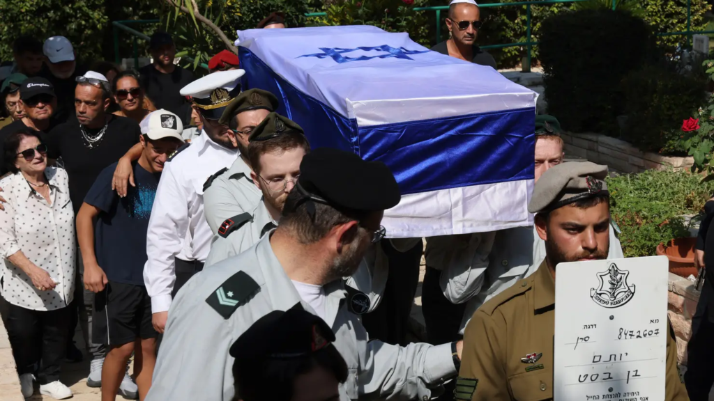 La famille et les proches accompagnent le cercueil du lieutenant parachutiste, Yotam Ben-Bassat, 25 ans.