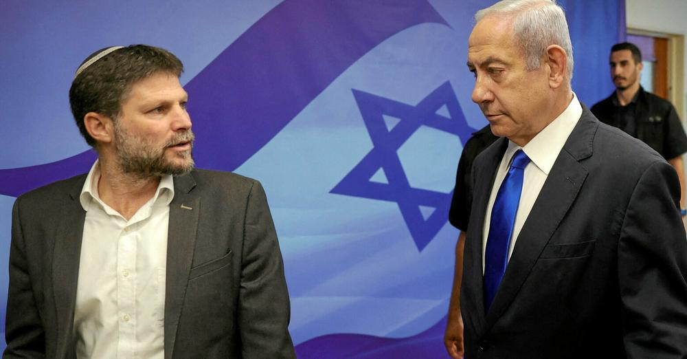 Le ministre des Finances israélien, Bezalel Smotrich, aux côtés de Benyamin Netanyahou.