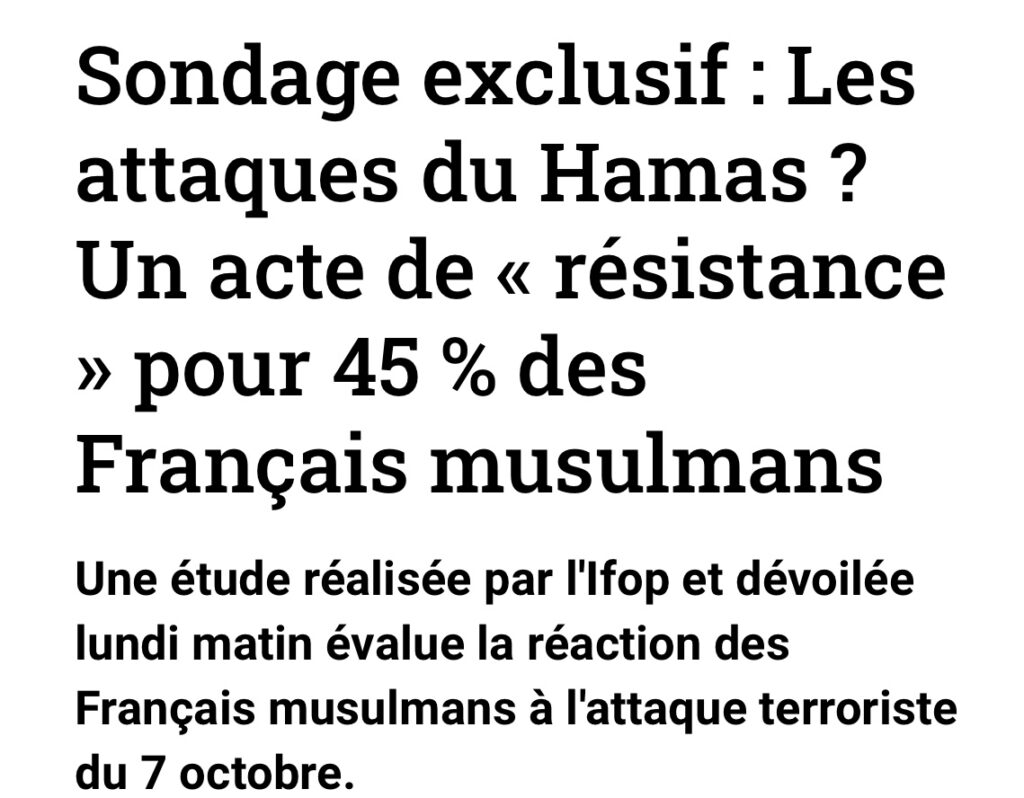 2 – 55% des Français musulmans jugent négativement les actions du Hamas commises le 7 octobre en territoire israélien mais ils sont 45% à y voir « des actions de résistance contre la colonisation », face aux 10% des Français qui pensent ainsi.