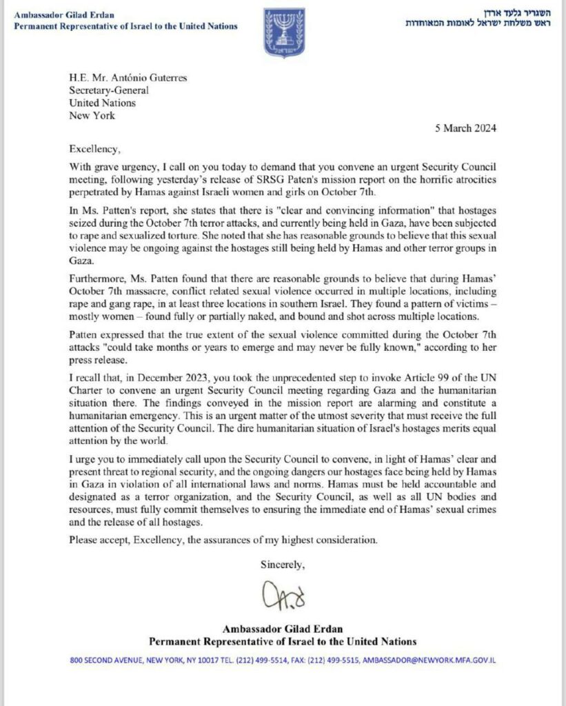 À la suite de la publication dudit Rapport, Gilad Erdan demande à Guterres une réunion urgente du Conseil de sécurité