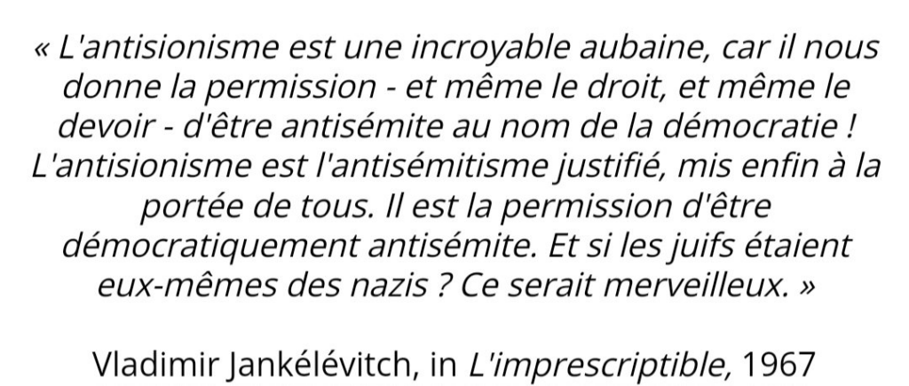 Aujourd’hui, dans les universités américaines et même, ces derniers temps à Sciences-Po, nombre d’étudiants parmi les plus en pointe dans la contestation de l’action d’Israël à Gaza sont des étudiants juifs, et qui l’affirment. De son côté, comme le gouvernement de Nétanyahou et ses soutiens estiment que ce que vit Israël en ce moment est d’ordre existentiel, toute critique radicale de la politique de colonisation, des bombardements massifs, du carnage en œuvre à Gaza, est qualifié d’antisionisme et d’antisémitisme.