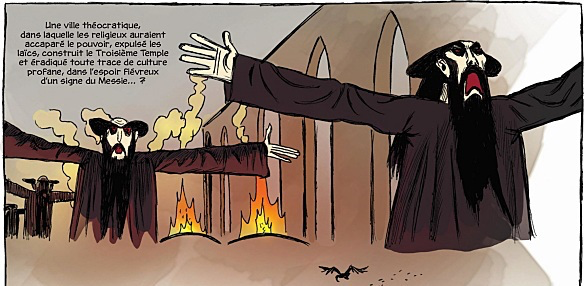 A la page 248, on y voit un Juif qui exhibe les traits de Satan, sur un fond de destruction apocalyptique de Jérusalem. Et comme si cela ne suffisait pas, le texte précise : “Une ville théocratique dans laquelle les religieux auraient accaparé le pouvoir, expulsé les laïcs, construit le Troisième Temple, et éradiqué toute trace de culture profane dans l’espoir fiévreux d’un signe du Messie..“. Si on voulait y déceler un parfait contenu antisémite, on ne pourrait trouver mieux.