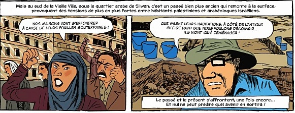 Et puis, il n’y a pas que de l’antisémitisme dans cette BD, mais aussi un peu de “critique” de la société civile israélienne. A la page 247, l’on voit un archéologue israélien faire fi du fait que les excavations archéologiques dans la Cité de David à Silwan mettent en danger d’effondrement les habitations arabes. Charmant, non ?! Et tellement fidèle aux procédures de la Société Archéologique d’Israël, l’une des plus scientifiques au monde.