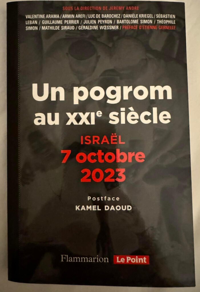 Un très grand merci à mon amie Françoise Monteilhet qui me l’a offert, pour ce livre, « Un pogrom au XXI ème siècle », écrit par un collectif de journalistes du « Point » qui se rendirent en Israël immédiatement après le 7 octobre 2023 pour rassembler des images, des témoignages et garder la mémoire des faits à chaud, craignant avec raison, que très peu de temps après, le narratif changerait…