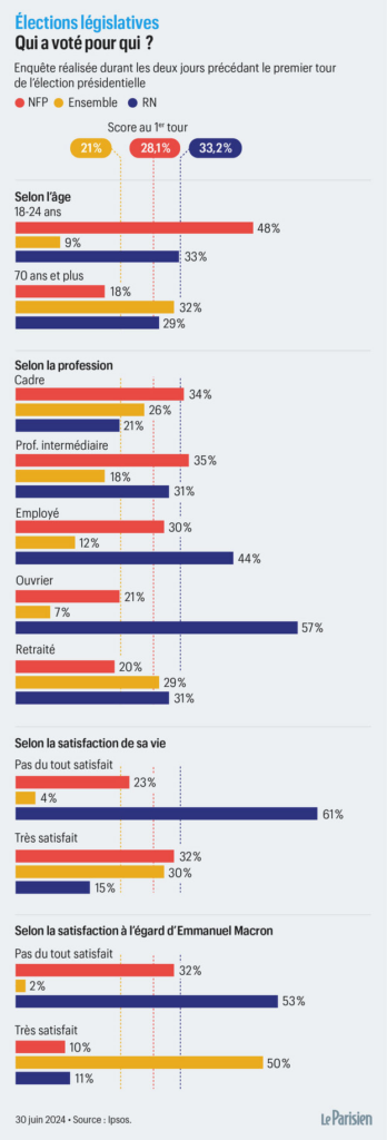 La victoire du Rassemblement national et de ses alliés issus des Républicains au premier tour des élections législatives, ce dimanche, est-elle surtout due à une partie de l’électorat ? La gauche unie au sein du Nouveau Front populaire a-t-elle toujours compté sur ses « bastions » traditionnels ? Le camp macroniste surperforme-t-il de nouveau chez les retraités et les cadres ?