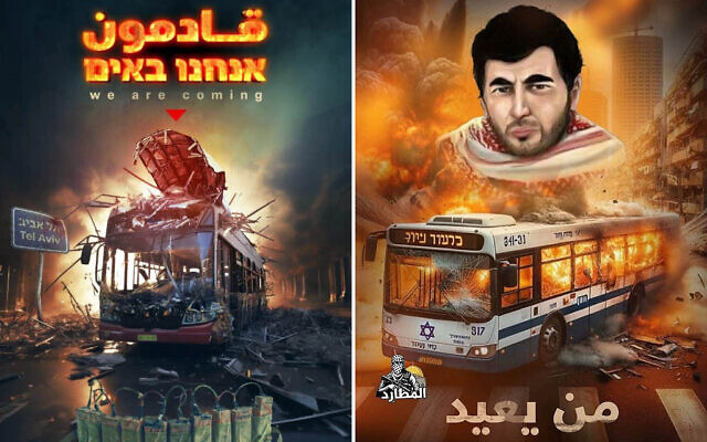 Suite à cette déclaration, le Hamas a diffusé sur les réseaux sociaux des affiches montrant des images de bus de Tel Aviv éventrés par des explosions. Les légendes, écrites en arabe, en hébreu et en anglais, disaient avec audace : « Nous arrivons. »