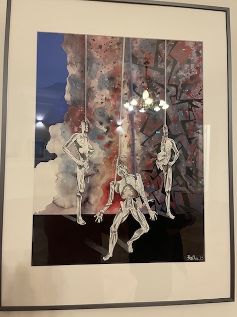 Étaient exposés vingt œuvres de Pierre Relkin dont deux peintures à l’huile et dix- huit gouaches. La première peinture commémorait la ‘rave-party’. Elle exprime « la félicité et l’insouciance d’avant le pogrom (tableau 1). La deuxième de l’après pogrom, annonce « l’espoir d’un futur représenté par le héron blanc qui symbolise la clarté, la pureté, la lumière intérieure et la maturité divine. Il chante le renouveau espéré dans un paysage exalté » (tableau 2).