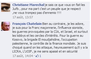 Un internaute lui demande pourquoi il s’en prend particulièrement aux juifs. Et François Chatelain de répondre : « je les adore, je suis pour la Franc maçonnerie, l’influence sioniste, les guerres provoquées par la CIA, et Israël, et surtout les lobbys et les cercles d’intérêts. Pour la guerre au Kosovo, la brigade El moudjahidine, l’occupation palestienne, le contrôle de la finance mondiale. Je suis choqué quand on les attaque, heureusement qu’il y a la LICRA, l’UOIF, je me sens apaisé et en sécurité. »