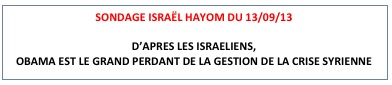– Israël : Si la Syrie est désarmée de ses armes chimiques, il s’agit d’une réalisation importante pour Israël qui a bien fait de garder le silence. Et la mobilisation de l’AIPAC au nom du président Obama a été éprouvée mais n’a pas nui à l’image d’Israël.