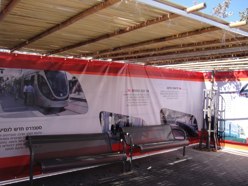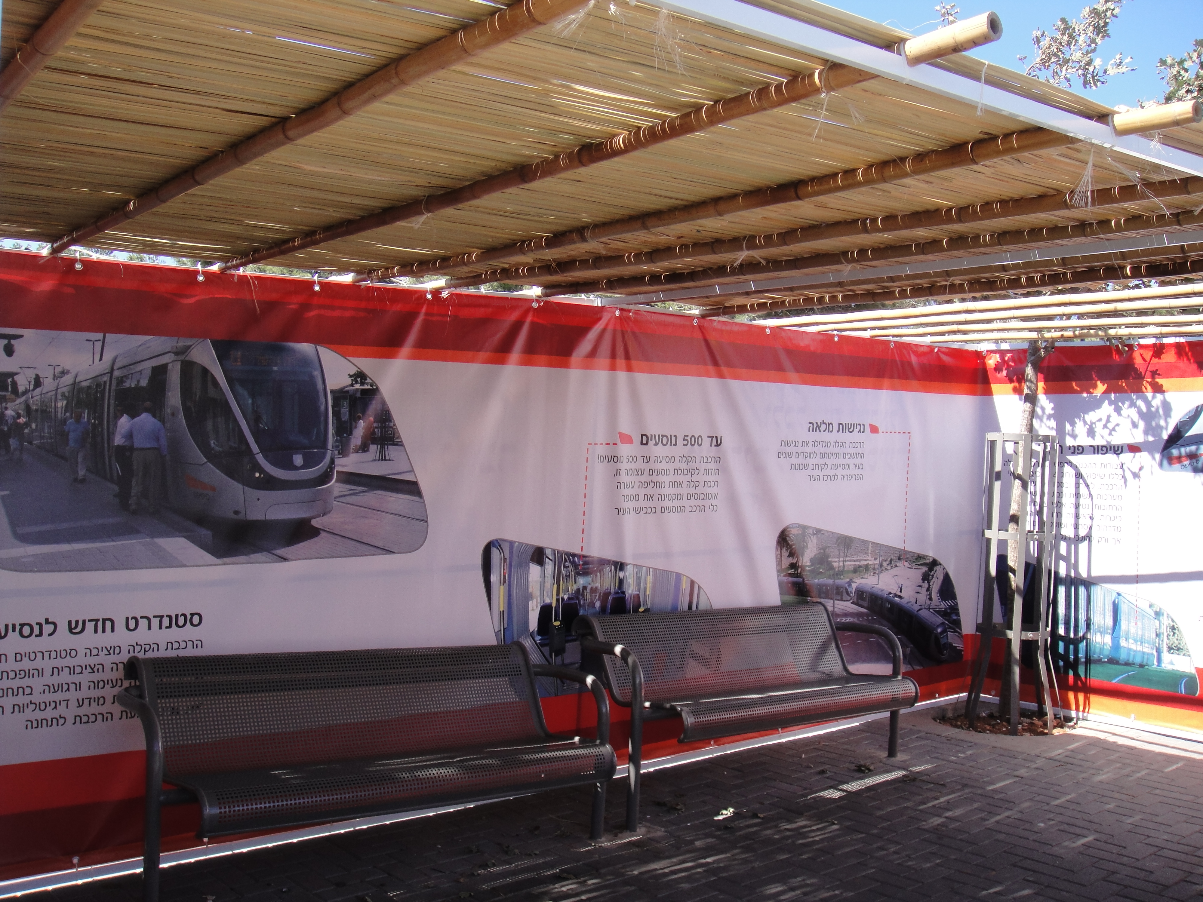 Le Tramway de Jérusalem propose à ses usagers de s’asseoir sur des bancs publics soigneusement intégrés dans sa Soucca, en attendant le train.