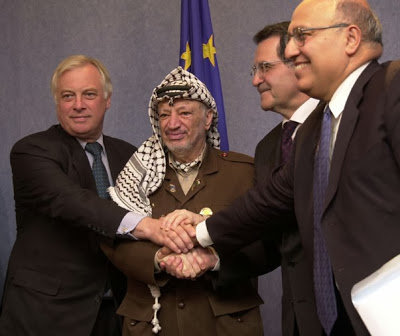 On se serre la main à Bruxelles en mai 2001 : Chris Patten, actuel président de la BBC (un des media les plus anti-israélien), Yasser Arafat, Romano Prodi (l’ami du Hamas), Nabil Shaath [Source]
