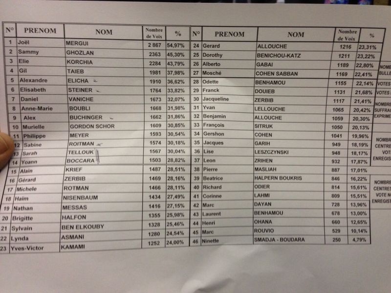 Joël Mergui le président sortant des consistoires, qui conduisait la liste AJC 2013, celle qui comptait le plus de femmes et de jeunes, obtient une victoire absolue, un véritable raz de marée : 11 membres sur 14 ont été élus.