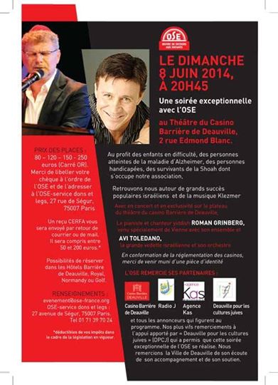 Un nouveau week-end prolongé s’annonce pour profiter du printemps, après les fêtes de chavouot, place a la détente. Le dimanche 8 juin au soir, venez nombreux a Deauville pour assister a un événement phare, le concert exceptionnel organisé par l’OSE au Théâtre du Casino. Vous découvrirez le pianiste et chanteur yiddish Roman Grinberg venu spécialement de Vienne avec son ensemble et Avi Toledano, la grande vedette israélienne et son orchestre.