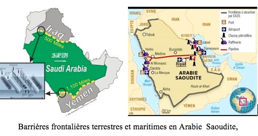 Un mur de 1200 km sépare les Etats-Unis et le Mexique. Un no man’s land militarisé de 248 km entre les deux Corées existe depuis 1953. Une barrière sino-coréenne de 1416 km empêche depuis 2006 la population de Corée du Nord de fuir la dernière dictature stalinienne de la planète. L‘Arabie saoudite a fait construire par EADS une frontière de sécurité qui fera à terme 9000 km (projet Miksa). Le groupe européen s’est bruyamment félicité de « ce contrat mirifique de sécurisation des frontières » (Les Echos, 2 juillet 2009).
