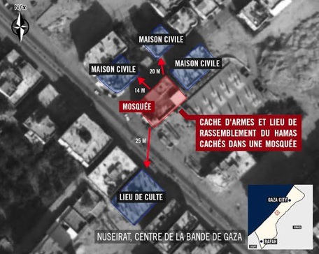Bouclier humains : le Hamas fait quant à lui utilisation de la population de Gaza comme bouclier humains, cachant ses armes et sites de lancement de roquettes au sein de maisons, mosquée, écoles et infirmeries (voir photo ci dessous). Il transforme ainsi des bâtiments civils en cible militaires légitimes. Le porte-parole du Hamas lui même appelle les habitants de Gaza à s’interposer entre les armes du Hamas et les frappes ciblées de l’armée israélienne.