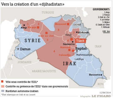 La situation semble donc assez claire: un groupe armé commandé par un chef puissant et ultra- religieux est en train dʼinstaller un empire islamique en Irak et en Syrie. Il mène une guerre de terrain rapide et efficace, semant la terreur parmi les populations qui vivent la guerre civile depuis 10 ans. IL instaure une paix “armée” selon les préceptes de la Sharia. Il bénéficie de circonstances favorables : un soutien de certains émirats arabes du golfe est évoqué; mais la Turquie pratique aussi une neutralité complaisante depuis 2003, lʼarmement de lʼarmée islamique transiterait par la Turquie.