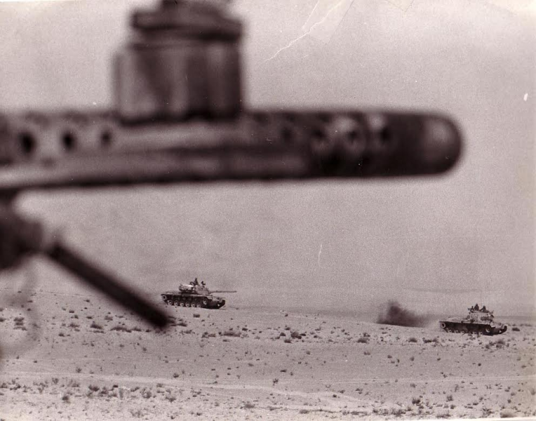 « Je me souviens de cette image. Elle a été prise avec mon appareil photo, mais c’est mon canonnier qui l’a prise. On m’y voit converser avec le chef de section qui opérait juste au nord de ma compagnie. Nous étions en Egypte, et il n’y avait que quelques chars pour couvrir un énorme secteur. »