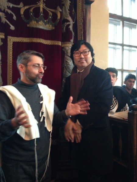 Le groupe s’est ensuite rendu à Birkenau (Auschwitz-II), qui fut le principal lieu d’extermination des Juifs, distant de trois kilomètres d’Auschwitz-I. Au mémorial pour les morts du camp, situé au bout du rail de chemin de fer qui le traverse et entre les ruines de deux chambres à gaz, le Grand Rabbin de France a improvisé une digne et émouvante cérémonie inter-religieuse, au cours de laquelle chacun des responsables de culte a pris la parole, avant que ne soient allumées 6 bougies, en mémoire des 6 millions d’âmes victimes de la barbarie nazie et que ne retentisse le son du Chofar.