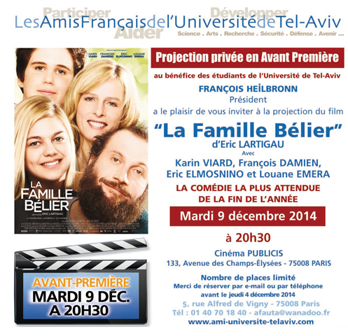 Les amis français de l’Université de Tel-Aviv organisent 2 projections en avant premières au profit des étudiants du département cinéma de l’Université de Tel-Aviv et du laboratoire du Professeur Yehiel Elkabetz qui travaille sur la maladie d’Alzheimer.
