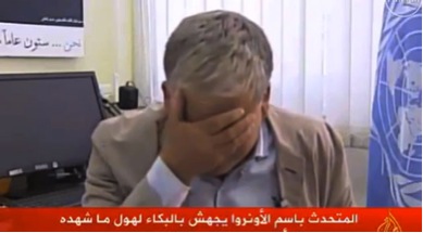 On se souvient du grand numéro télévisuel de Chris Gunness au cours de l’opération « Bordure Protectrice », qui avait fait un tour du monde cathodique très remarqué, surtout dans les pays musulmans, où en évoquant les victimes de Gaza, il s’était effondré en pleurs à l’image, traumatisé par « les souffrances des victimes des bombardements aveugles de l’aviation israélienne.