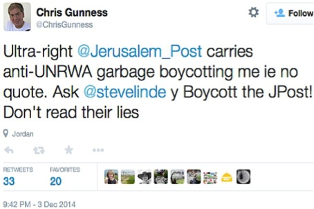 Le torchon brûle entre l’UNRWA et le Jérusalem Post. Chris Gunness, porte-parole assermenté des Nations-Unies appelle au boycott du journal israélien le Jérusalem Post et viole ainsi allègrement l’accord de neutralité du Département d’État.