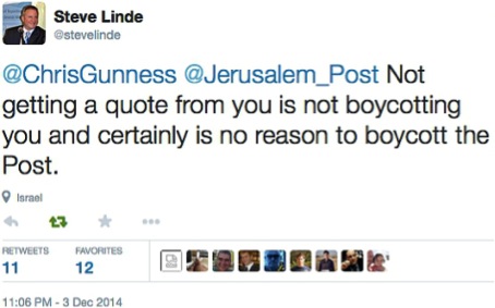 Très pédagogue, Steve Linde, le rédacteur en chef du Jérusalem Post, a répondu à Gunness: « Peut-être Gunness ne comprend-il pas la différence qu’il y a entre un article dit d’ « Opinion » et un article d’information. Un article d’opinion – qui est ce qu’a écrit Bassem Eid, est un texte écrit par quelqu’un qui n’est pas un journaliste employé par le journal, quelqu’un qui possède une expertise dans un domaine particulier et qui exprime ses opinions ou ses vues personnelles sur un sujet particulier ».