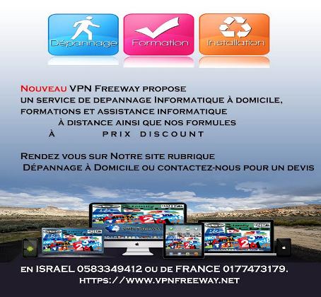 Enfin VPN Freeway vous propose un service spécialisé d’intervention (Dépannage Informatique à Domicile). En Israël un technicien se déplace pour vous aider à résoudre tous vos problèmes d’ordinateur, et vous propose des cours d’informatique. En dehors d’Israël nous pouvons la société procède à une prise en main à distance.