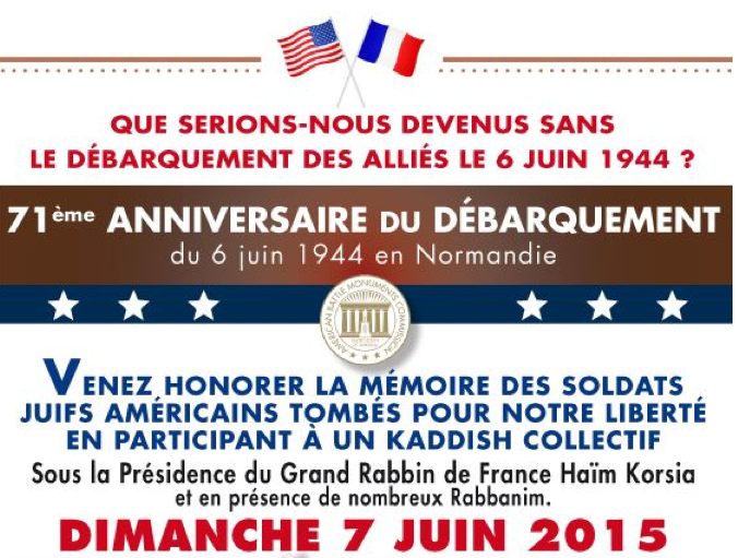 Nous organisons, le dimanche 7 juin 2015, un VOYAGE de la MEMOIRE au Cimetière Mémorial Américain de COLLEVILLE-sur-MER en Normandie, pour honorer la mémoire des soldats juifs américains et soldats juifs canadiens, tués lors du débarquement en juin 1944.