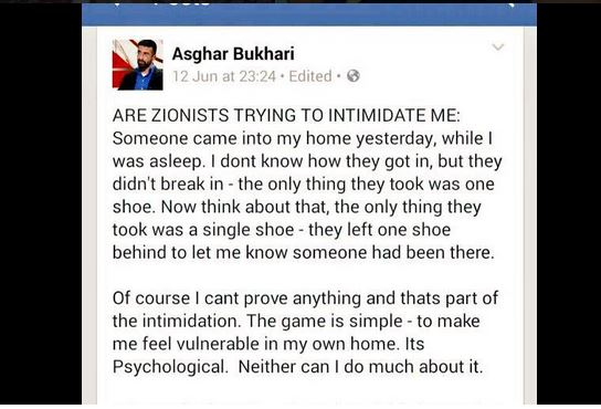 Asghar Bukhari, un activiste musulman britannique, a sorti la meilleure du monde vendredi soir : il a accusé sur facebook le Mossad de lui avoir volé une chaussure. Mais oui, une chaussure!