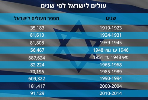 Le rythme le plus élevé de l’Alyah, fut pendant les premières années de la création de l’Etat d’Israël. Jusqu’à 1951, 687,624 juifs ont fait leur Alyah, presque la moitie d’entre-eux venaient d’Europe. Entre 1952 et 1954 la baisse fut dramatique (seulement 54,627 olim). La vague d’Alyah s’est renforcée entre 1955 et 1957 (166,492 âmes), la plupart d’entre-eux venaient d’Afrique du Nord tout comme entre 1961 et 1964.
