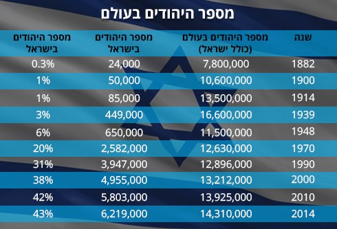 En 1939, un peu avant la Shoah, 16,600,000 juifs vivaient à travers le monde, et parmi eux 449,000 dans le foyer National Juif – c’est-a-dire environ 3%. En 1948, la création de l’Etat d’Israël et après la Shoah, le nombre de juifs ne représentait plus que 11,500,000, dont 650,000 (6% des juifs) vivaient en Israël.