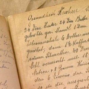 « Gâteaux pour la jeune accouchée, bonbons au caramel de Baden, strudel aux quetsches, Linzertorte… » Un livre de recettes écrit à la main, couvert de papier kraft, relié d’une simple ficelle.