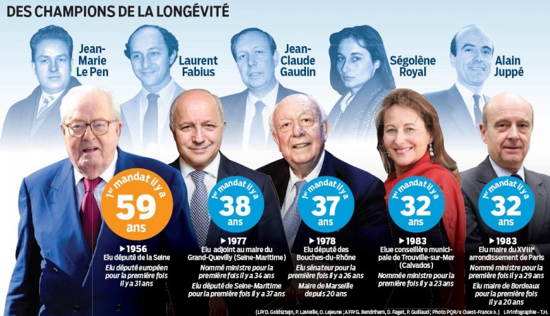 Ils ont le sentiment de voir les mêmes têtes depuis des décennies. Et pour cause ! Sur les photos des années Mitterrand, Ségolène Royal, Laurent Fabius et Michel Sapin étaient déjà ministres. Au Sénat, le doyen Paul Vergès culmine à un vénérable 90 ans. Vous avez dit gérontocratie ? Aux électeurs aussi de balayer devant leur porte. S’ils réclament du sang neuf, ils ont tendance, une fois dans l’isoloir, à préférer les élus expérimentés. Il n’est qu’à voir Alain Juppé, 70 ans, chouchou des sondages.