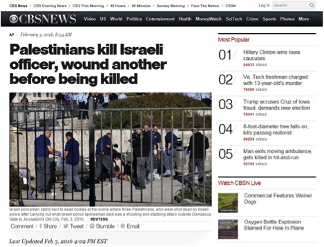 Titre qui a fait bondir le gouvernement israélien. Suite à cette réaction, CBS News a accepté de modifier quelque peu ce titre insultant l’intelligence : « Des Palestiniens ont tué un officier israélien, en ont blessé un autre avant d’être tués ».