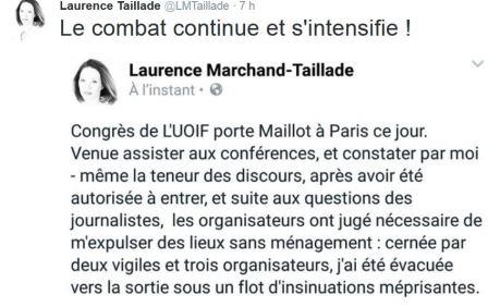 Mais Laurence Marchand-Taillade trouvera certainement d’autres soutiens, d’autres encouragements, parmi ceux qui ne se voilent pas la face, et qui savent que l’UOIF représente un danger pour la laïcité, pour nos libertés et pour notre sécurité. Continuez votre travail Madame, avec notre admiration, et notre adhésion totale!