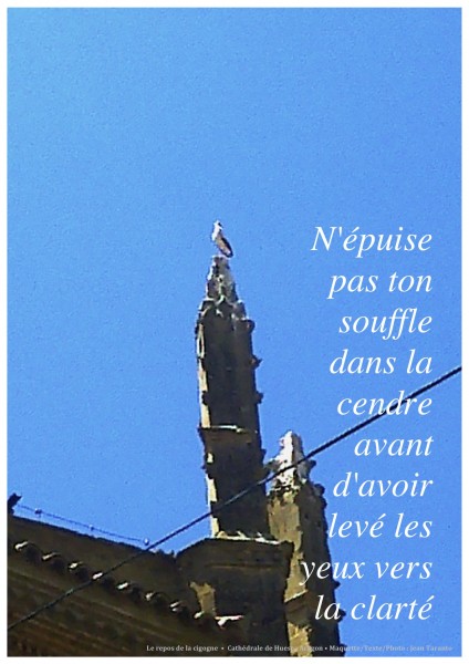 Je vois chez moi dans les eaux basses laissées par les pluies qui passent les cigognes fétus au bec, un si long bec orange mûre comme planté dans la blanche écume. La queue noire et l’œil curieux, elles font leur nid nouveau à la cîme des bouleaux et parfois aussi des clochers.