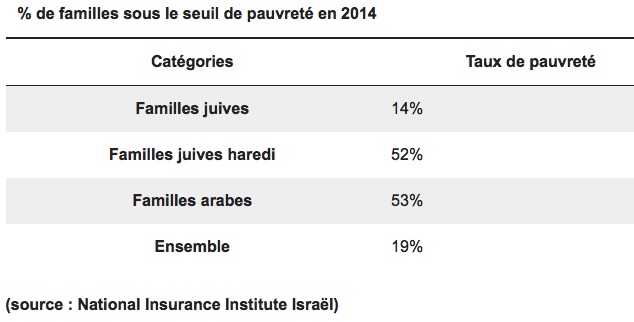 [1] Israël a opté pour une définition relative de la pauvreté : est considéré comme pauvre celui dont le revenu disponible (après paiement des impôts et perception des transferts sociaux) est inférieur à la moitié du revenu médian du pays, ajusté selon la taille de la famille. En 2014 le seuil mensuel de pauvreté pour un couple est de 4 923 shekels, soit 1145 euros. Pour un couple avec deux enfants, le seuil de pauvreté est fixé à 1832 euros.