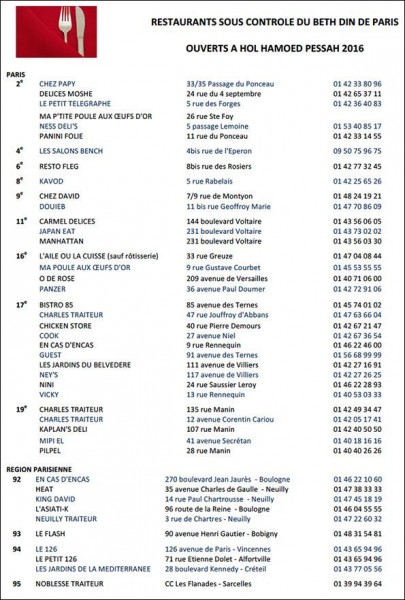 Restaurants Beth Din de Paris ouverts à PESSAH 25 avril 2016 Tribune Juive Communauté 0 actualitescommunauté juiveFrancetoutes les actualités juiveswww.tribunejuive.infoSuivez-nous et partagez