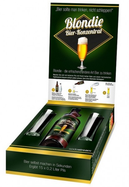 Jusqu’à présent, SodaStream était connu pour sa fabrication maison d’eau gazeuse et de sodas. A présent, la machine à gazéifier Sodastream s’enrichit d’une nouvelle fonction « le Beer Bar »: à partir de l’eau pétillante, on ajoute un concentré de bière portant le nom de « Blondie ». Il s’agit d’une nouvelle bière à l’arôme de houblon. La bouteille de concentré de bière de 1 litre donne environ 15 verres de 20 cl de bière soit 3 litres de bière avec 4,5 % de teneur en alcool.