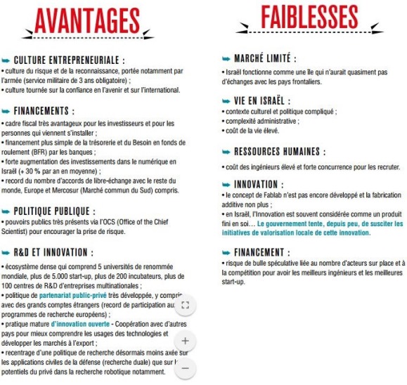 Il en ressort dans un premier temps que les atouts principaux sont les technologies matures, le fort esprit entrepreneurial, une R&D orientée usages, un accès facilité aux grands comptes et aux réseaux internationaux.