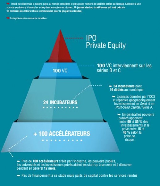 A l’image de BPIFrance, le bureau du Chief Scientist, au Ministère de l’économie israélien soutient la R&D des entreprises israéliennes mais aussi étrangères dans le pays en favorisant certains secteurs économiques ou zones géographiques. Une 20aine d’incubateurs et plus de 40 programmes d’accélération assurent le travail d’accompagnement soutenu par l’état, et on compte aujourd’hui une centaine d’accélérateurs privés, généralistes ou spécialisés.