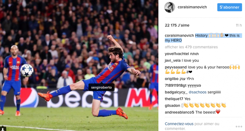 Suite à l’incroyable victoire de Barcelone et du but de son chéri a la dernière seconde délivrant tout le stade, Coral Simanovich a posté sur instagram cette photo et ce message :